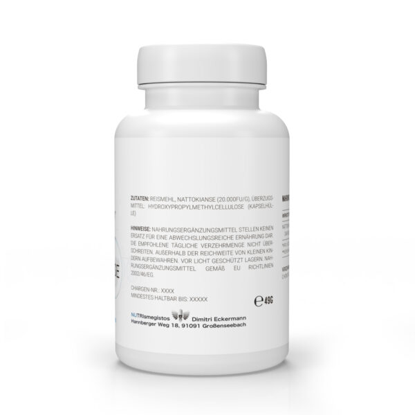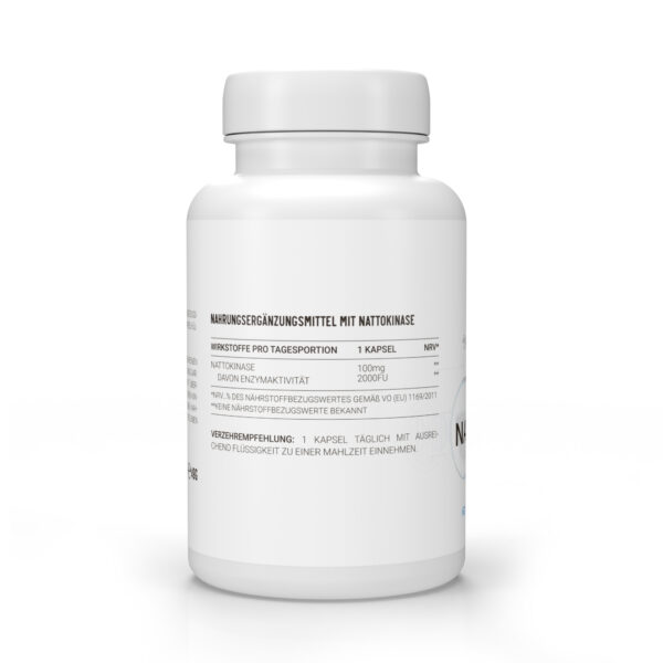 Nattokinase ist ein natürliches Enzym, das aus Natto, einem fermentierten Sojaprodukt, gewonnen wird. Es kann die Blutgerinnung regulieren und die Durchblutung fördern, indem es Fibrin, ein Protein in Blutgerinnseln, abbaut. Eine Kapsel enthält 2.000 FU. FU bedeutet Fibrinolytic Unit und beschreibt damit das Aktivitätsvolumen des Enzyms.