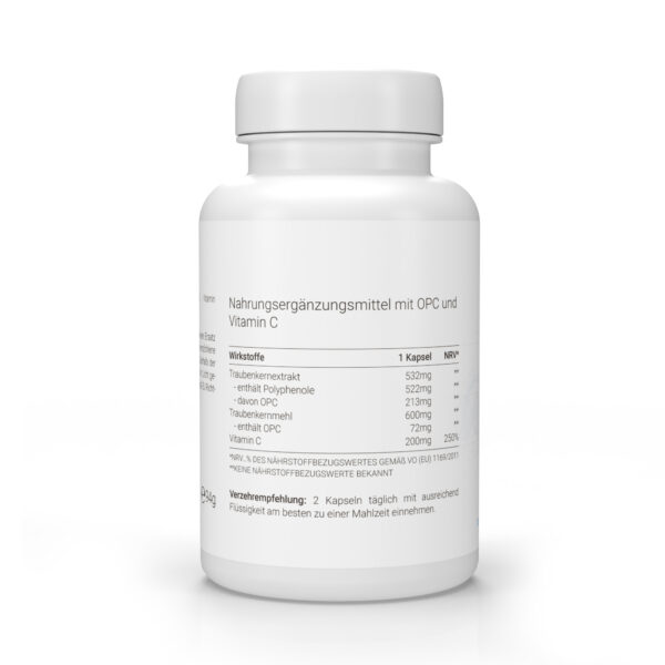 Diese synergetische Antioxidationsformel kombiniert oligomere Proanthocyanidine (OPC) aus hochwertigem Traubenkernextrakt mit Vitamin C in bioverfügarer Form. OPC als starkes Antioxidanz trägt zum Schutz der Zellen vor oxidativem Stress bei, während Vitamin C zusätzlich die Funktion des Immunsystems moduliert, Kollagenbildung fördert und Eisenaufnahme verbessert. In Phasen einer hohen Belastung des Immunsystems durch freie Radikale eine wertvolle Kombination.